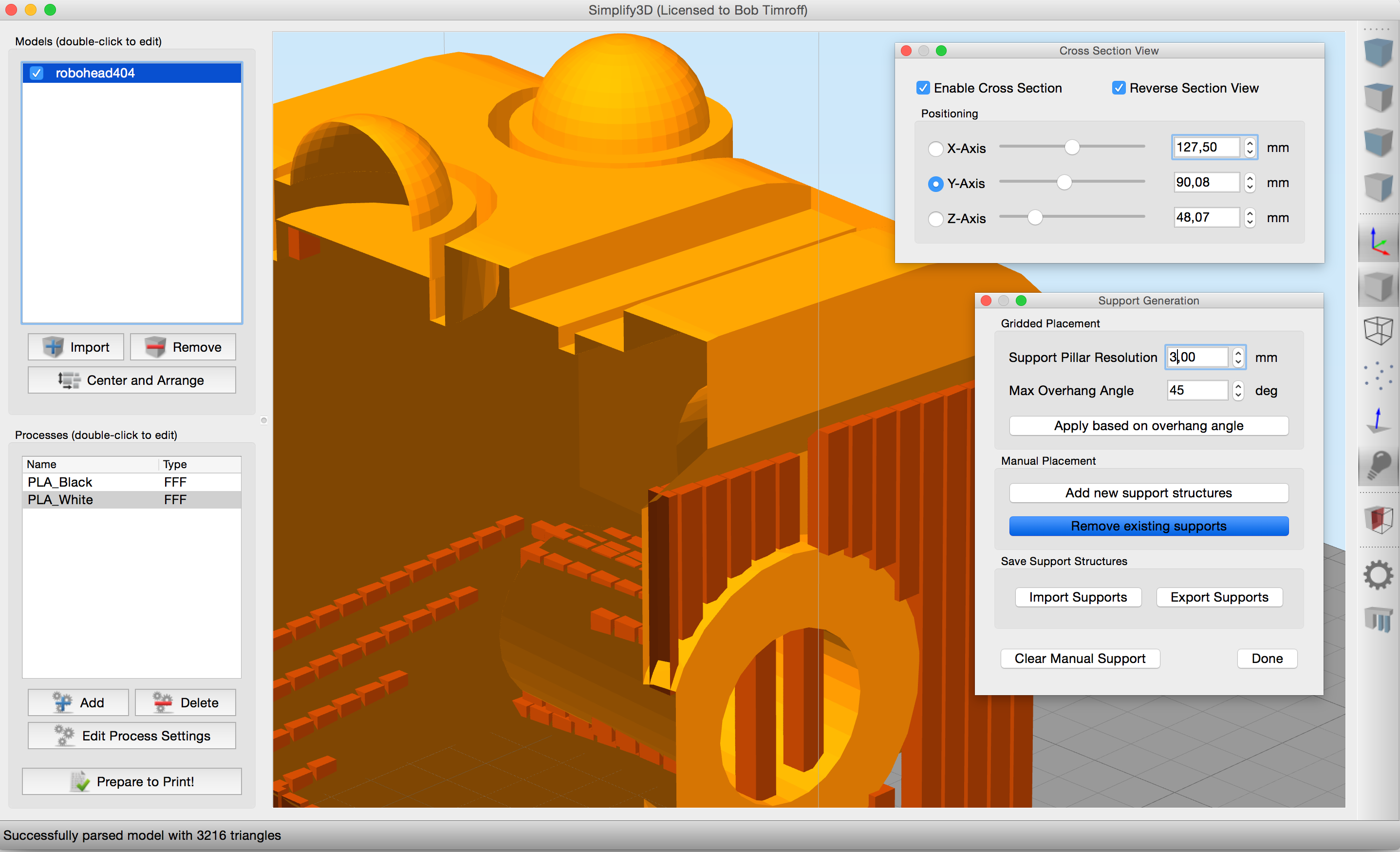 Een zeer handige functies van Simplify3D is het toevoegen van supportmateriaal ter ondersteuning van specifieke onderdelen van het 3d-model die in de lucht ‘hangen’. Behalve het automatisch toevoegen van ondersteunend materiaal kunt u dit ook zelf op de gewenste plekken toevoegen of verwijderen. In combinatie met de functie Cross Section, waarmee we een doorsnede van elk object kunnen weergeven, is het tamelijk eenvoudig om ondersteunend materiaal op ongewenste plekken te verwijderen omdat u elke onderdeel in het model hiermee beter kunt bekijken.