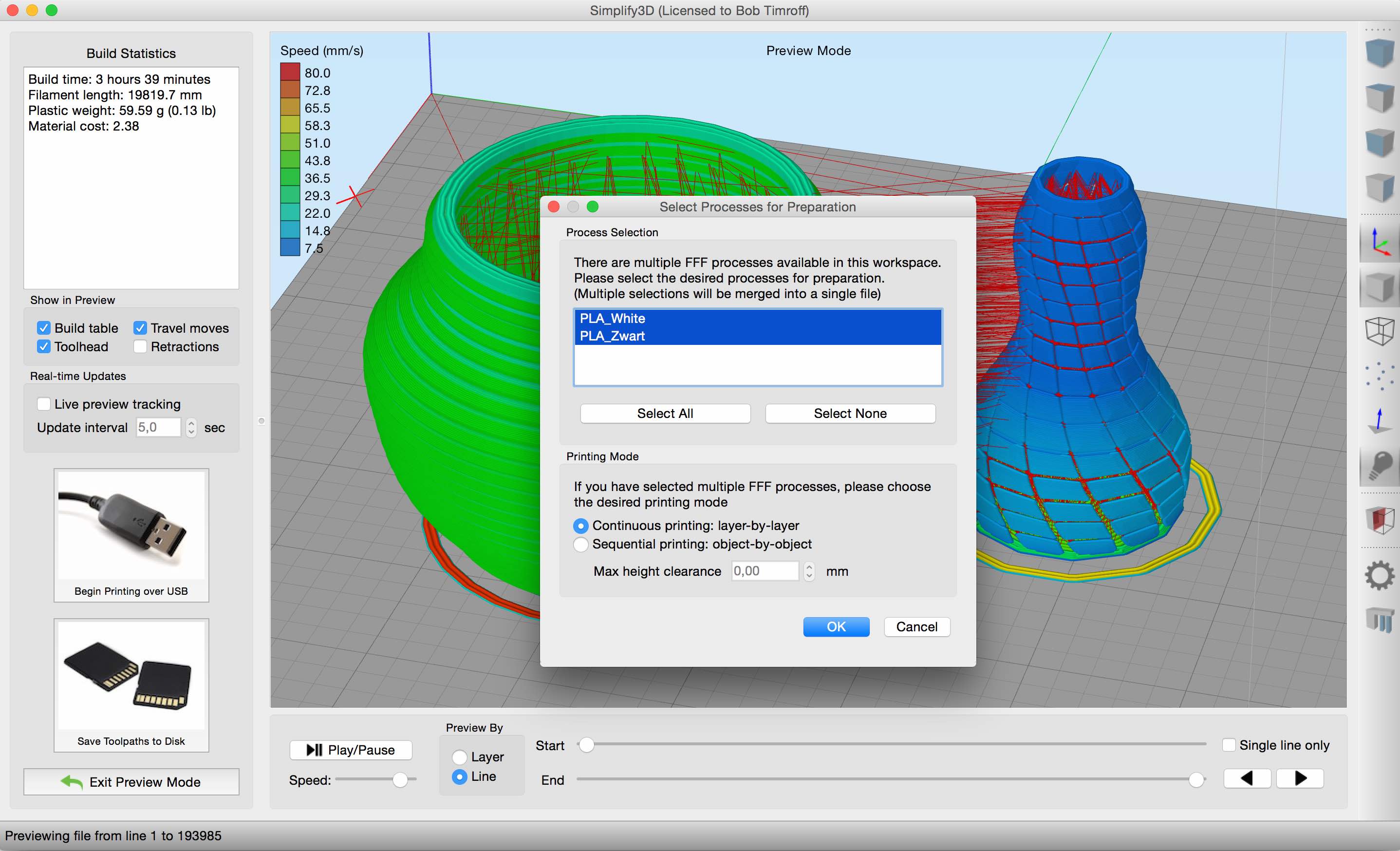 Met de knop ‘Prepare to Print’ wordt het 3d-object gesliced. De snelheid waarmee het programma 3d-objecten converteert naar g-code is ongeëvenaard. Simplify3D blijkt – zelfs bij zeer complexe 3d-objecten – gemiddeld 40 keer sneller te slicen dan andere slicingprogramma’s.